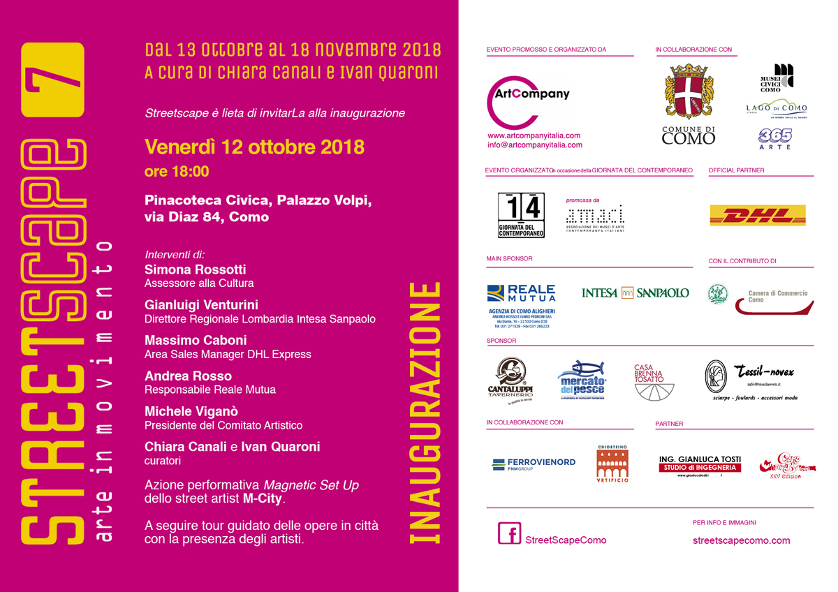 La settima edizione di StreetScape si realizza con il rinnovato sostegno della compagnia di assicurazioni italiana Reale Mutua Assicurazioni, Agenzia Alighieri di Como, grazie alla lungimiranza di Andrea Rosso e Ivano Pedroni, che per primi hanno creduto in questo progetto artistico e lo supportano dal 2013. A Reale Mutua si aggiunge il nuovo e fondamentale contributo di DHL Express Italy, leader mondiale nel settore della logistica, presente come Official Partner della manifestazione che, per la sua natura di mostra itinerante, policentrica, mobile, in movimento, si sposa alla mission di DHL Express. Sostanziale inoltre il contributo di Intesa Sanpaolo, che anche quest’anno supporta StreetScape confermando la sua vocazione di banca vicina alla città e pronta a sostenerne le iniziative più rilevanti per capacità progettuale e valorizzazione del patrimonio storico-artistico del territorio. Si ringrazia per il supporto Camera di Commercio Como, e per i contributi Cantaluppi Tavernerio – Mercato del Pesce, Casa Brenna Tosatto e Tessil Novex.