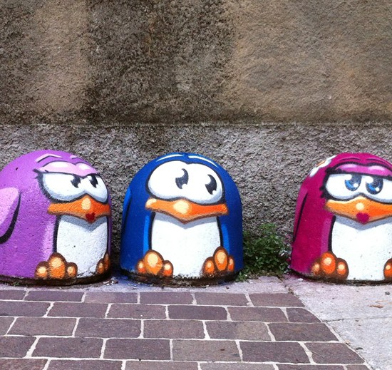 Paracarri stradali come pinguini, spruzzi colorati e un gigante fatto di foglie.